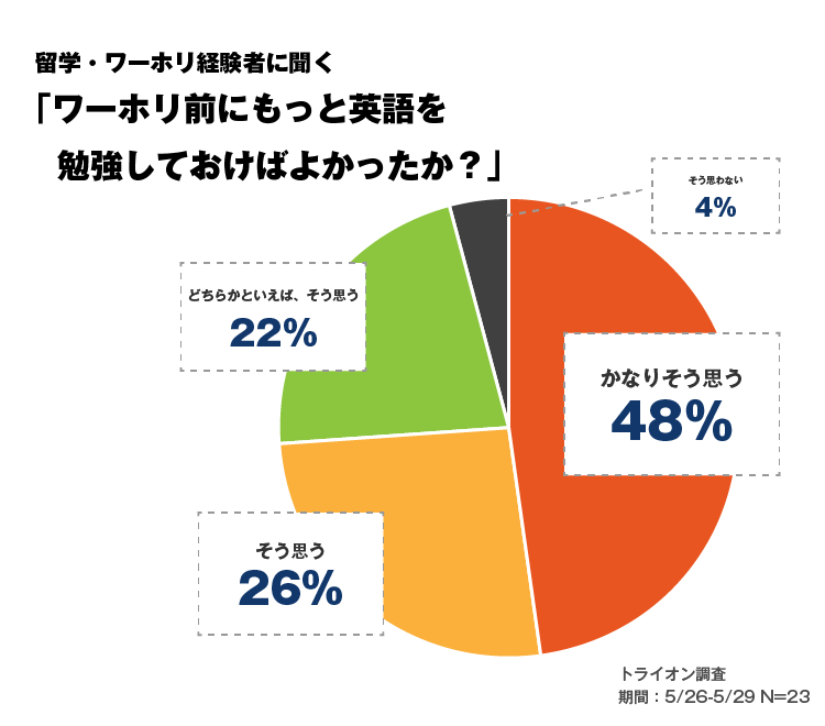 英語の基礎力がないと、現地の方と最低限のコミュニケーションを取ることができず、まともな仕事に就くことも難しくなります。 そのような環境では英語力を向上させるのも容易ではありません。ワーキングホリデーでより効率的に英語を習得し、多くの収入を得るためには、日本にいる時に英語の基礎力を習得しておくことが何よりも大切です。