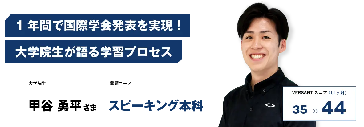 1年後の国際学会での発表を目標にトライズにご入会された甲谷様。英語で挨拶しかできなかった状況から、1年間の学習の過程を振り返ってご自身の変化についてお話を伺いました。