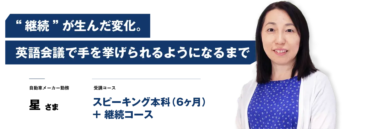 これまで試験勉強以外で特に英語を使う機会はなかったとおっしゃる星様。グローバル企業への転職を機に海外出張や英語で実施される会議に参加する機会が増えたことがきっかけで、トライズで英語学習をスタートされました。半年間プログラムに取り組まれた後、現在は継続コースで学習中です。