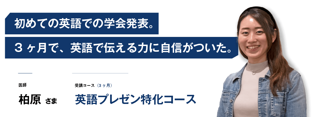 初めての英語での学会発表が決まり、トライズで3カ月間『英語プレゼン特化コース』を受講された柏原様。医師として日々ご多忙の中、英語学習と学会準備を積み重ねた結果、学会では見事Congress Encouragement Awardを受賞されました。柏原様の3カ月間の学習と今後の展望について、伺いました。